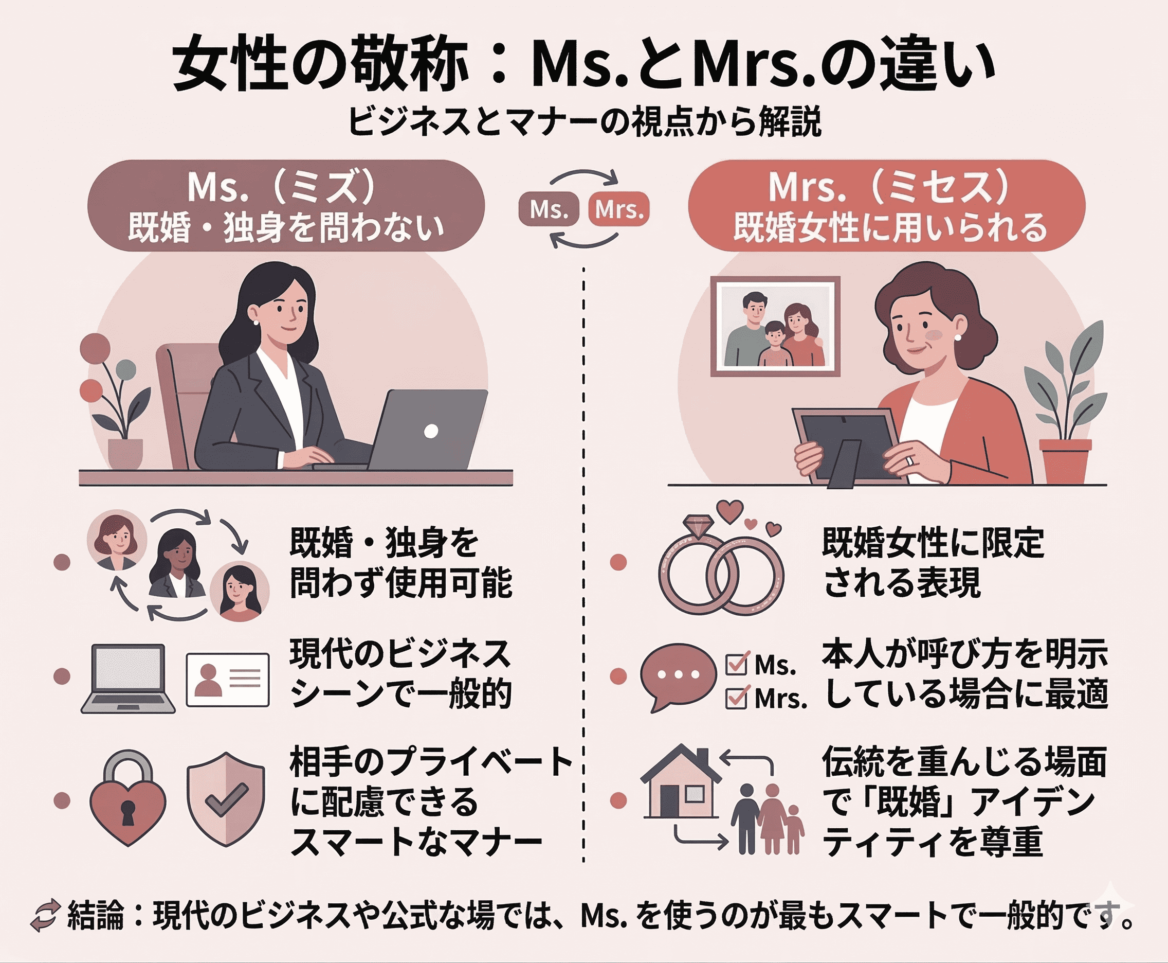 日本語の「〜さん」や「〜様」にあたる非常に重要な表現ですが、特に女性に対する Ms. と Mrs. の使い分けに迷う方は多いのではないでしょうか。