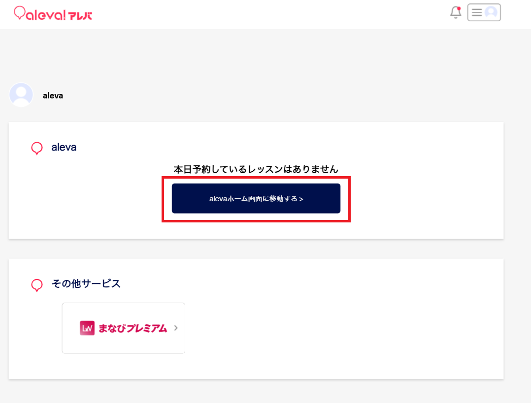 ログインすると以下の画面に遷移しますので、「alevaホーム画面に移動する」をクリックしてください。