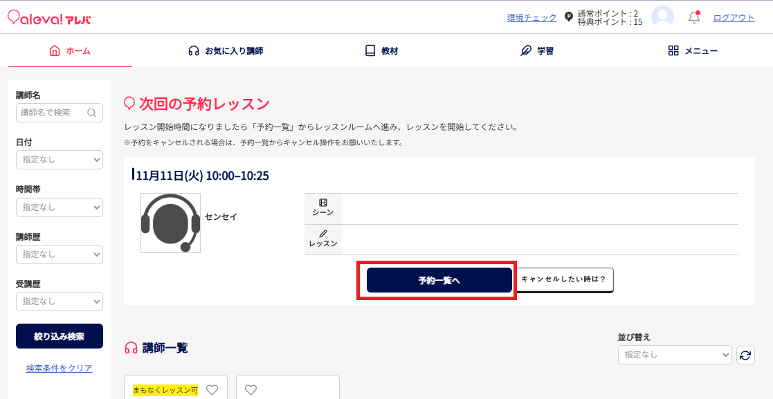 alevaのホーム画面上に、次回のご予約レッスンが表示されている場合、「予約一覧」から